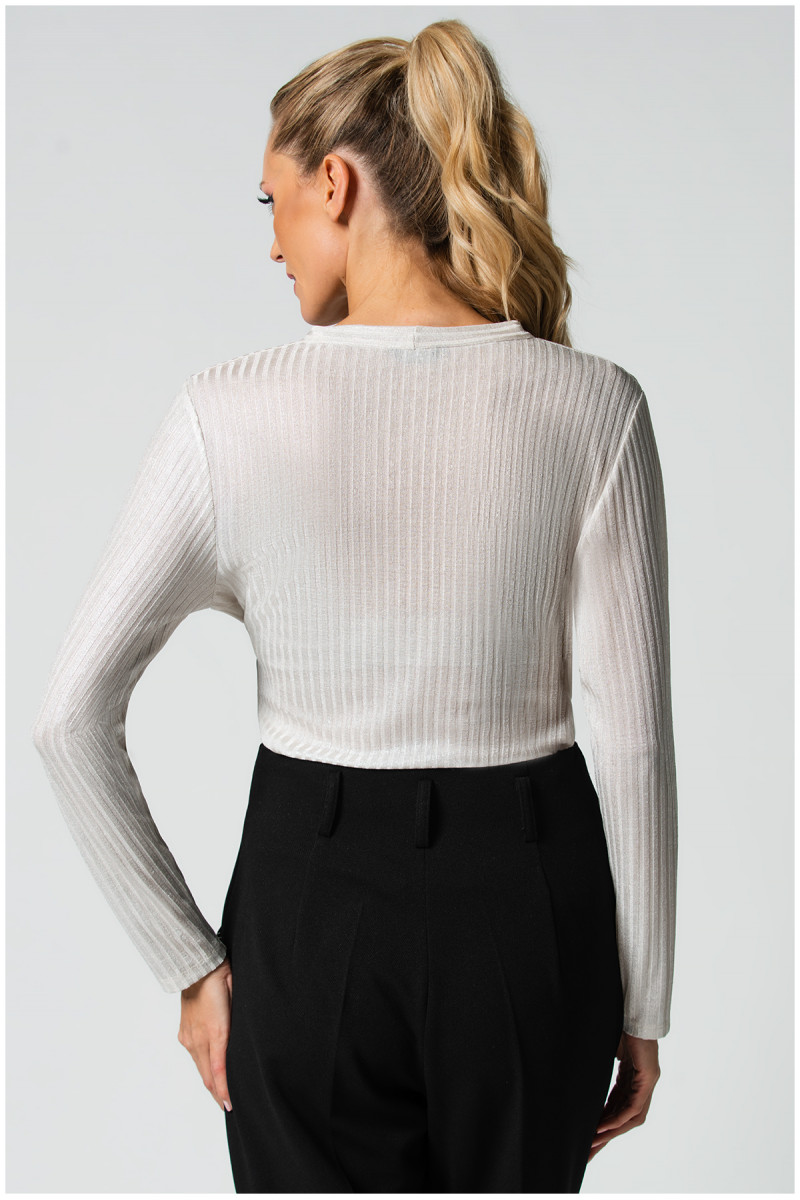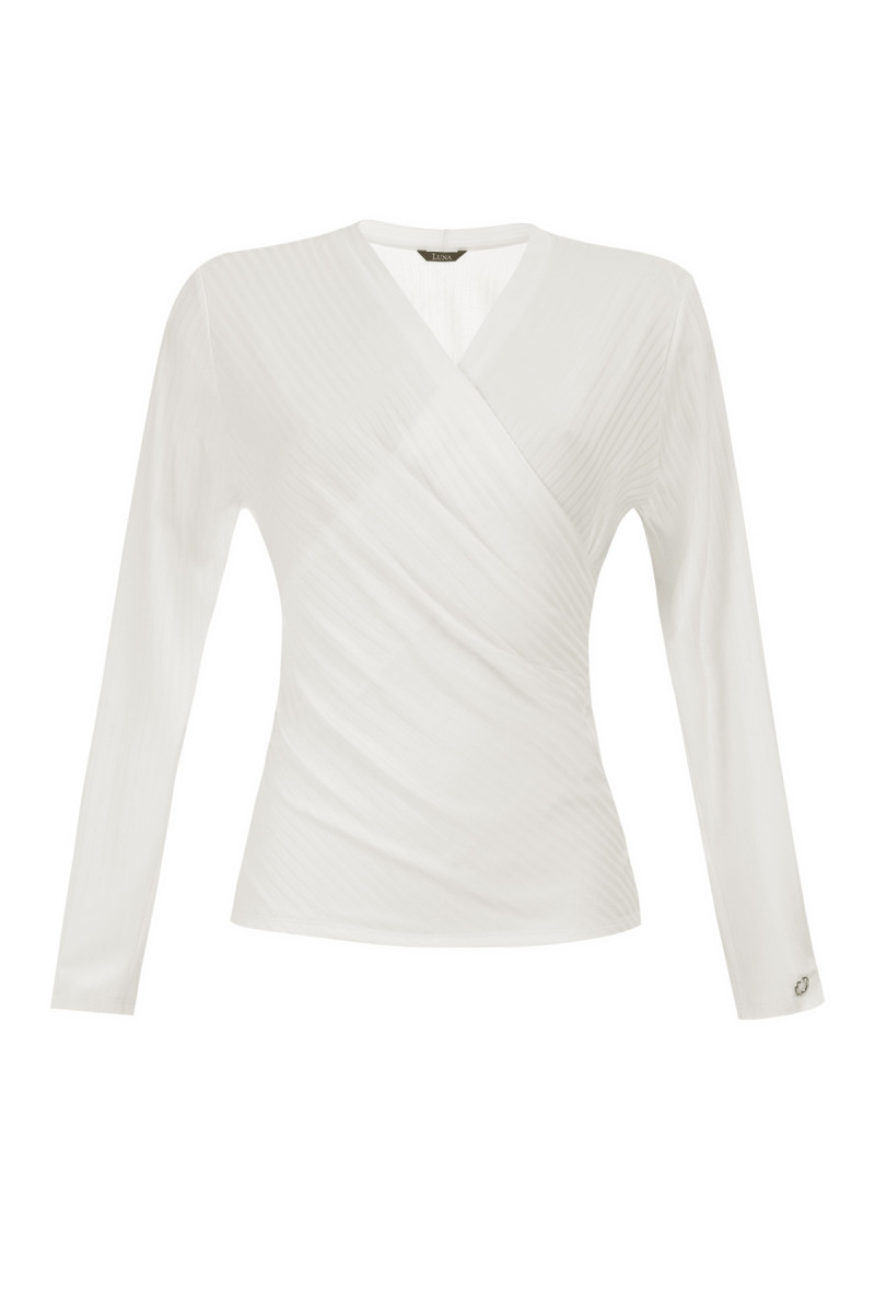 Svečana bež bluza sa preklopljenim V-izrezom, nežnim naborima i rebrastom teksturom koj...
