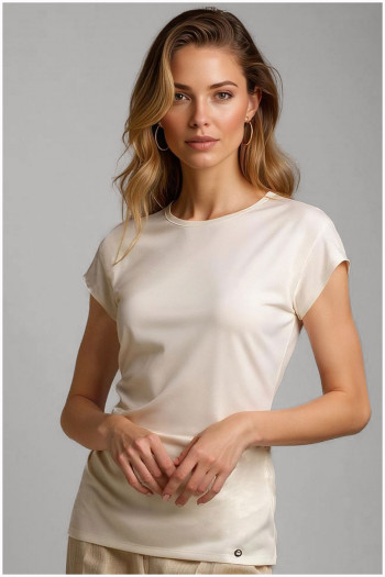 Elegantna bež bluza ravnog kroja sa dvostrukim V-izrezom i svilenkastom teksturom koja ...