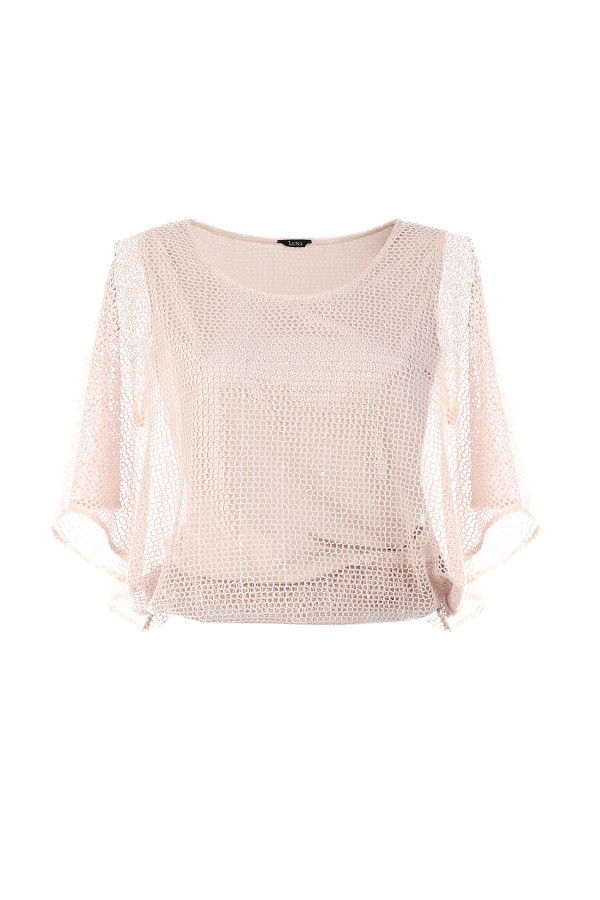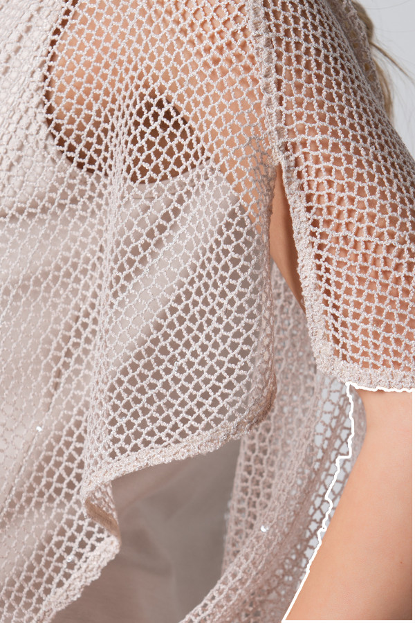 Mrežasta tunika u bež boji. Viskozna postava čini je vrlo prijatnom i udobnom za nošenje. Kombinujte je sa pantalonama iz iste kolekcije i postignite efektan outfit. Dopunite svoj outfit elegantnim brošem u vidu cveta koji se po potrebi može skidati.