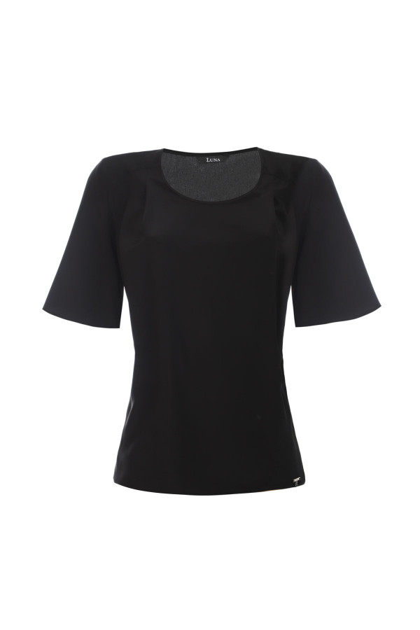 Jednobojna bluza sa kratkim rukavimao oplemenjena naramenicama.