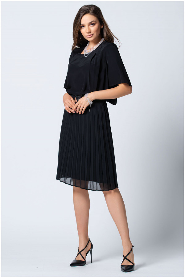 Kratka plisirana suknja modernog kroja oplemenjena efektnim detaljem u predelu struka.