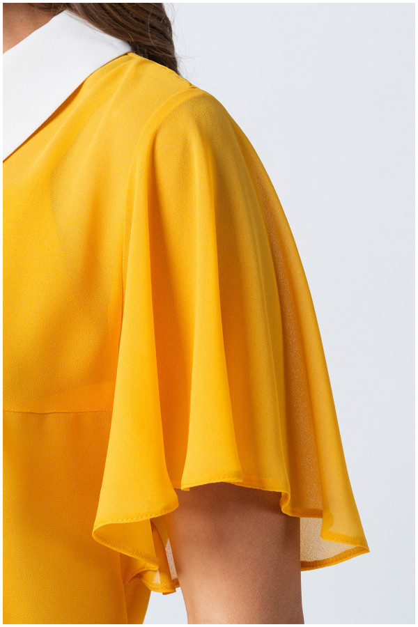 Ženstveni set na kratke lepršave rukave. Oplemenjen je belom kragnom, čineći model elegantnim. Savršeno se kombinuje sa pantalonama iz Luna asortimana.