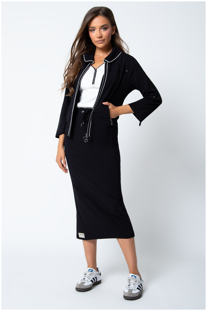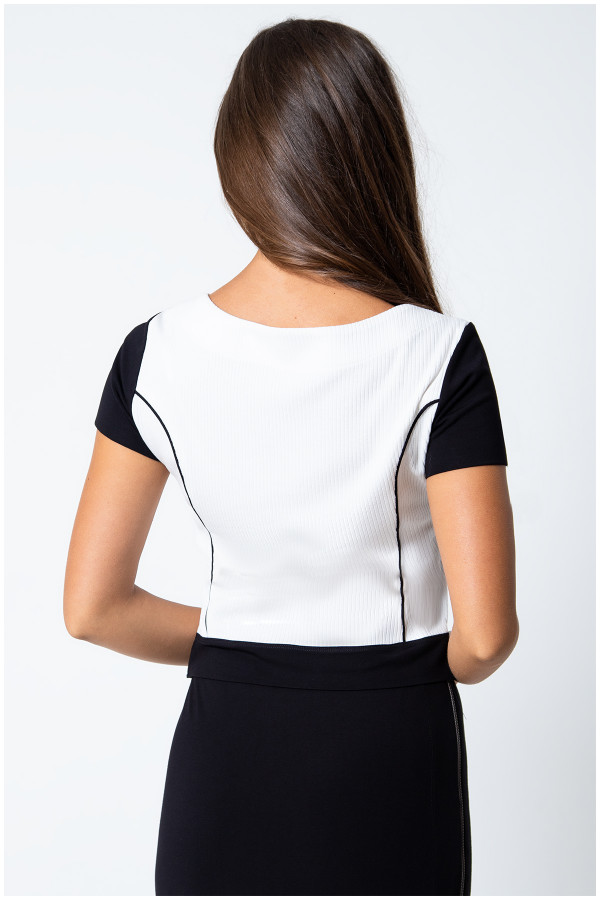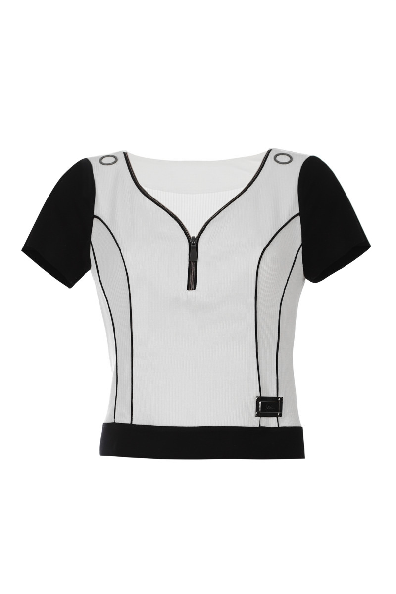 Majica kratkih rukava u nijansama bele i crne boje. Rajsferšlus u zoni dekoltea joj daje originalan i izuzetno interesantan izgled. Izrađena je od viskoze sa visokim procentom elastina što je čini veoma prijatnom za nošenje.