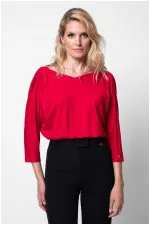 Ženstvena majica 3/4 rukava sa diskretnim naborima u predelu ramena. Napravljena je od viskozne tkanine sa visokim procentom elastina što je čini vrlo prijatnom za nošenje.