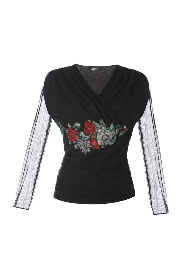 Viskozna bluza sa dekolteom na preklop odlična je osnova za formiranje outfita. Autentičnost joj dodaju providni rukavi i cvetne aplikacije sa prednje strane. Model je vrlo prijatan na koži.
