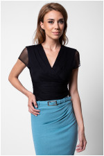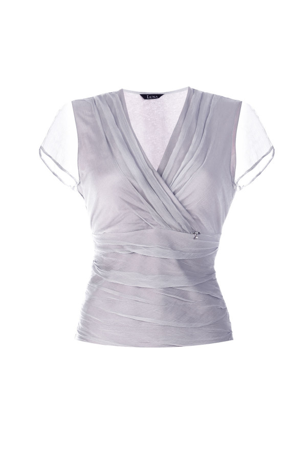 Jednobojna bluza sa kratkim transparentnim rukavima. Oplemenjena je naborima u predelu dekoltea i struka. Model ima bočni rajsferšlus. Savršeno se kombinuje sa suknjama i pantalonama iz iste kolekcije.