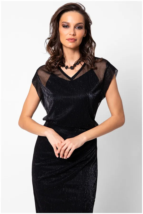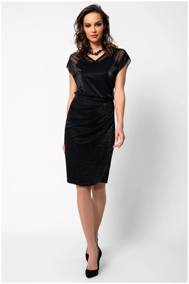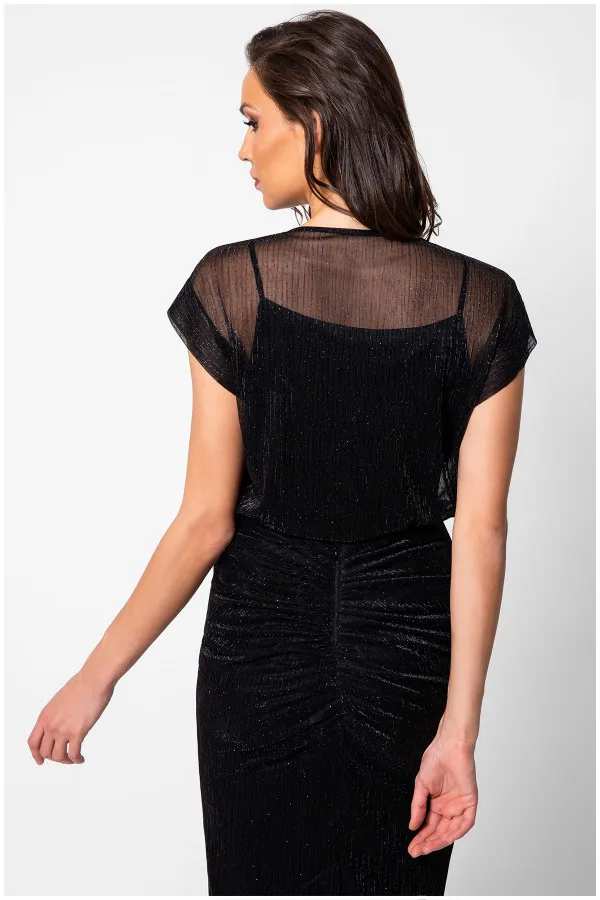 Elegantna kratka suknja sa metaliziranim vlaknima čiji kroj prati liniju tela.