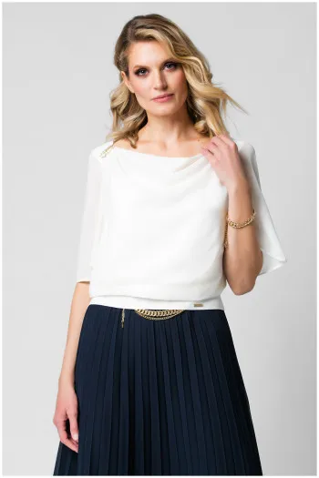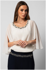 Elegantna tunika sa lepršavim prozirnim rukavima. Detalj u predelu vrata dodaje notu elegancije ovom modelu. Odlično se kombinuje sa širim pantalona od istog materijala, ali sjajno izgleda i u kombinaciji sa pencil suknjom.