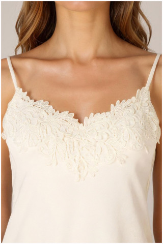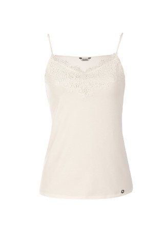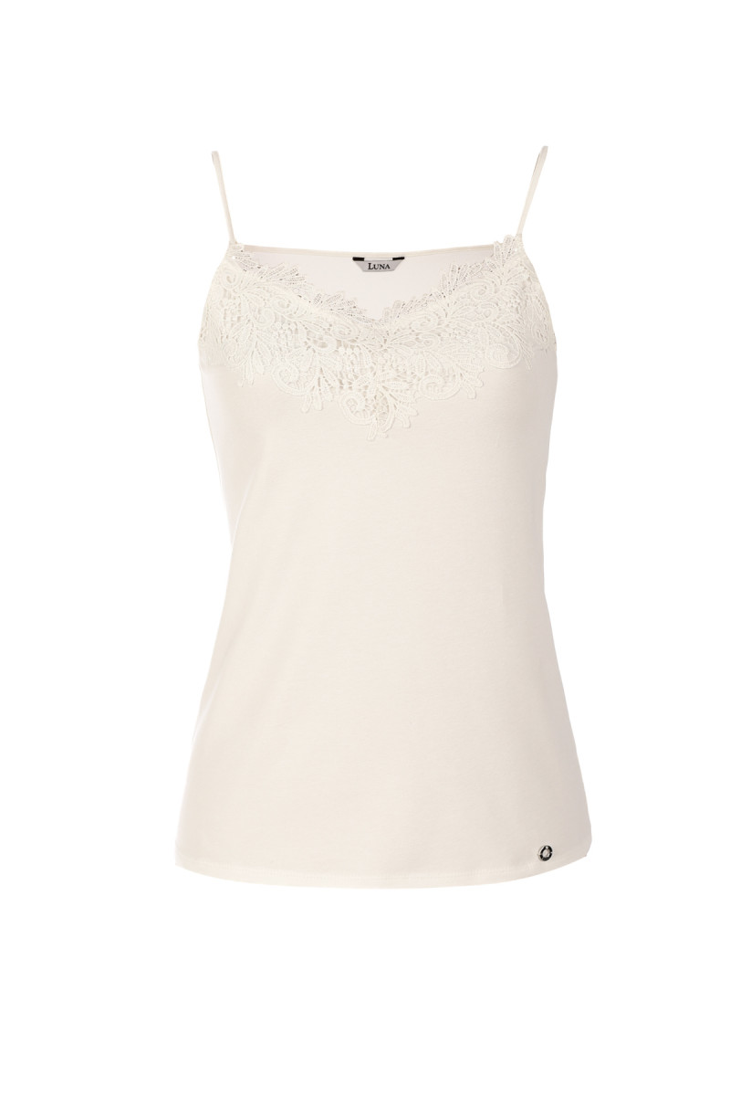 Jednobojna majica na bretele. Dekolte je oplemenjen čipkom dajući ovom modelu prefinjen i ženstven izgled. Kombinacija viskoze i elastina čini je jako udobnom i prijatnom za nošenje.