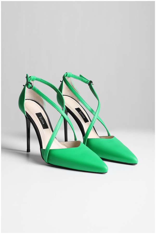 Elegantne crne salonke od prirodne kože sa dekorativnom kopčom i potpeticom visine 5 cm...