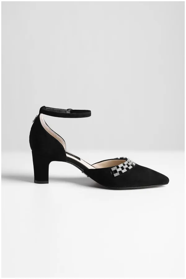 Elegantne crne salonke od prirodne kože sa dekorativnom kopčom i potpeticom visine 5 cm...