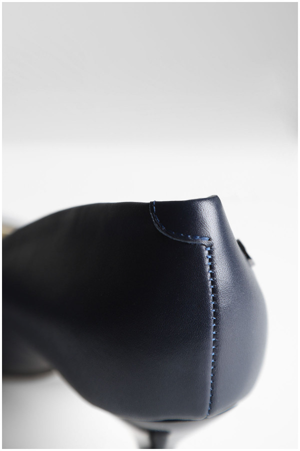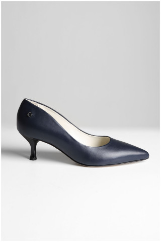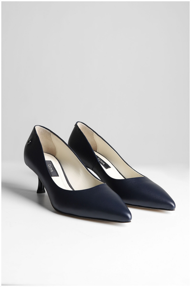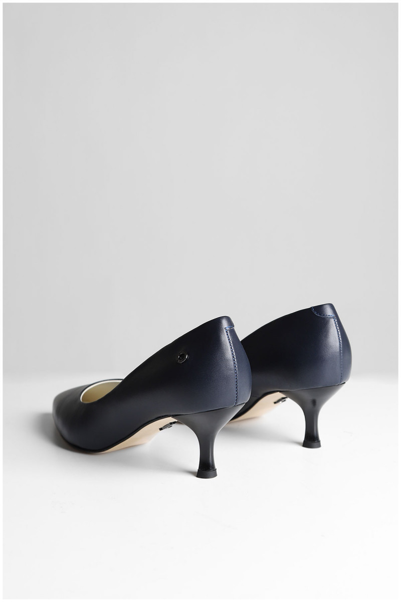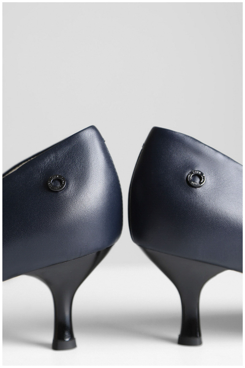 Elegantne teget salonke od prirodne kože sa dekorativnom kopčom i potpeticom visine 5 c...