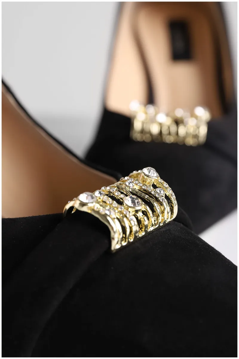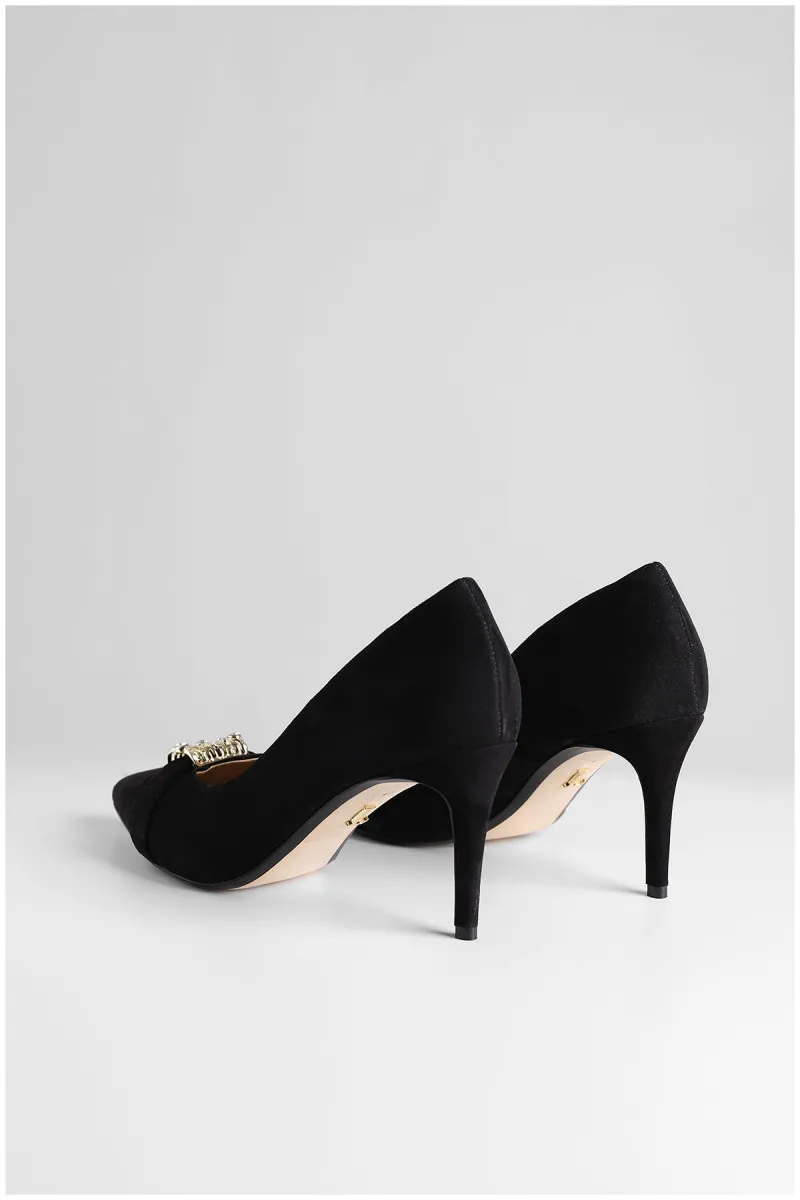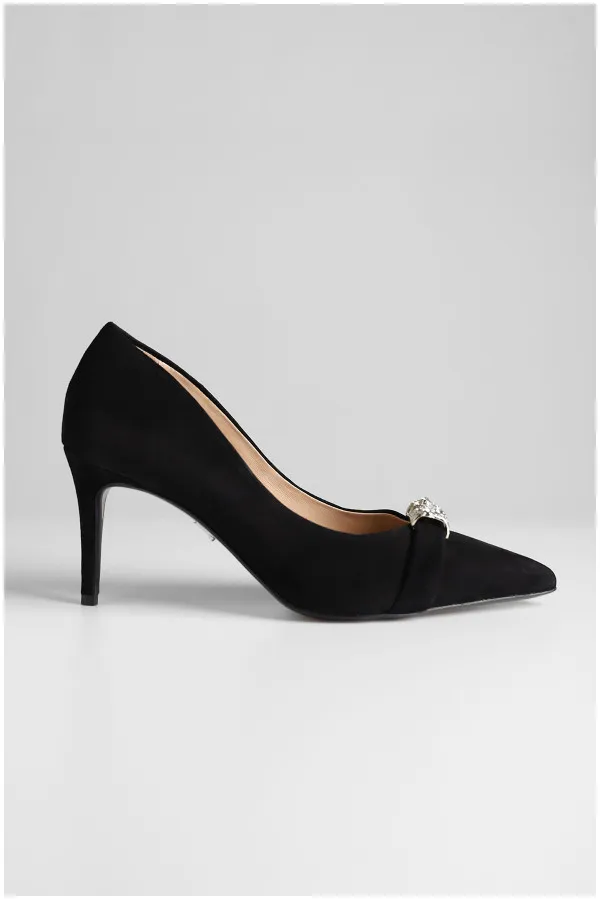 Elegantne crne salonke od prirodne kože sa dekorativnom kopčom i potpeticom visine 5 cm...