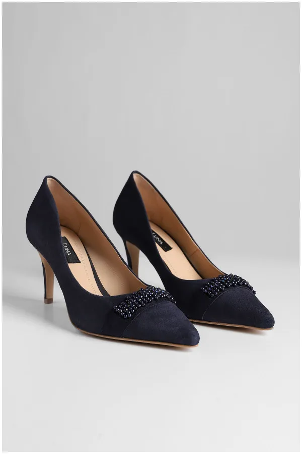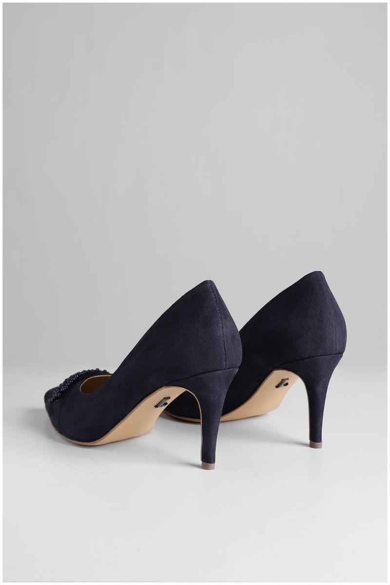 Elegantne teget salonke od prirodne kože sa dekorativnom kopčom i potpeticom visine 5 c...