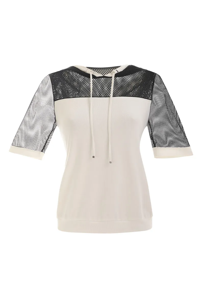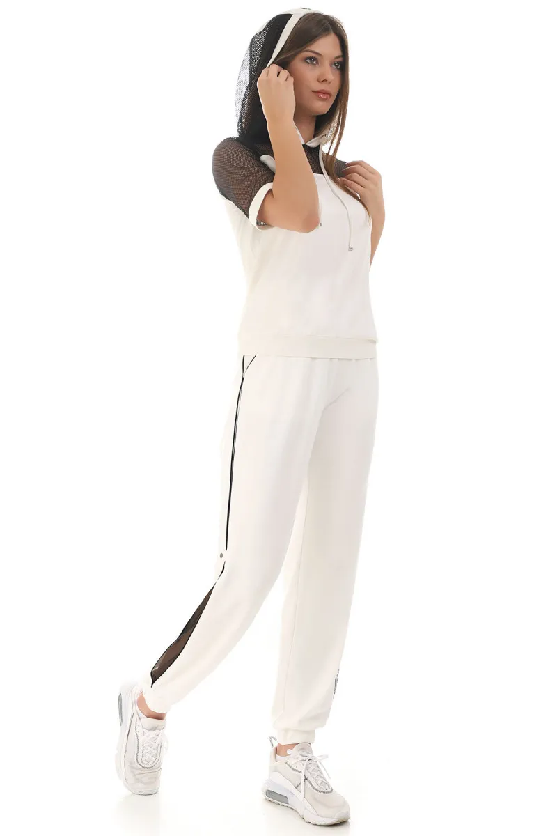 Ležerni duks u beloj boji sa mrežastim detaljima u zoni dekoltea i na rubovima rukava.