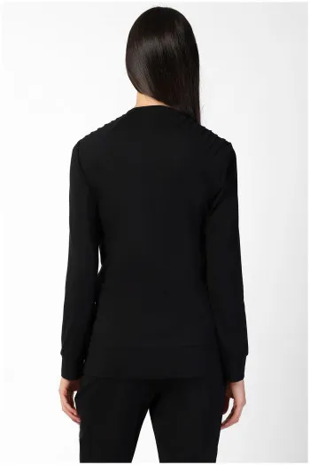 Ležerni duks u crnoj boji sa mrežastim detaljima u zoni dekoltea i na rubovima rukava.