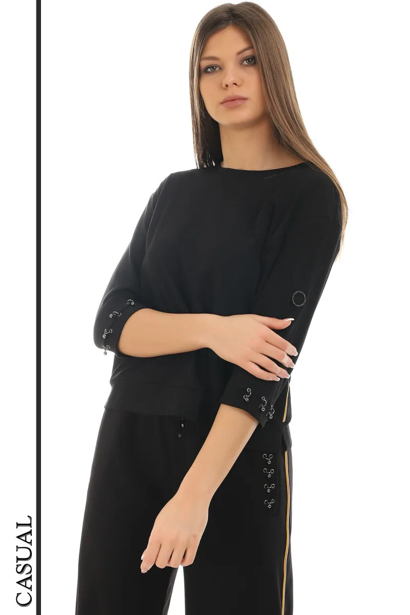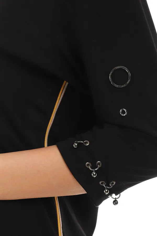 Ležerni duks u crnoj boji sa mrežastim detaljima u zoni dekoltea i na rubovima rukava.