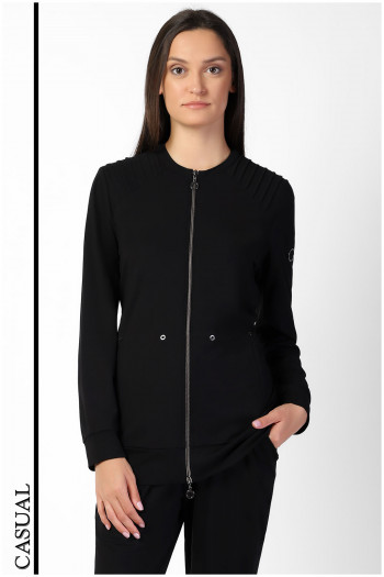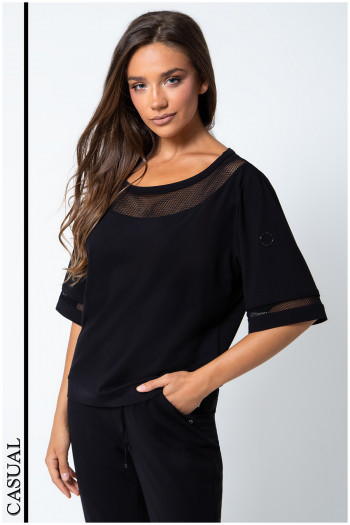Ležerni duks u crnoj boji sa mrežastim detaljima u zoni dekoltea i na rubovima rukava.