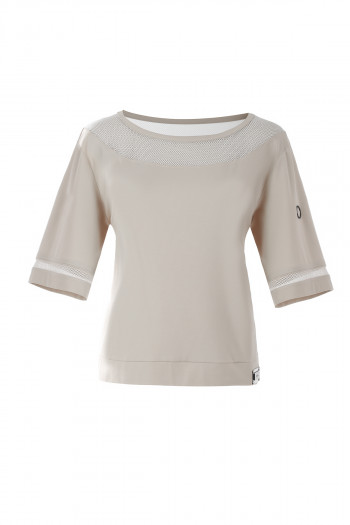 Ležerni duks u bež boji sa mrežastim detaljima u zoni dekoltea i na rubovima rukava.