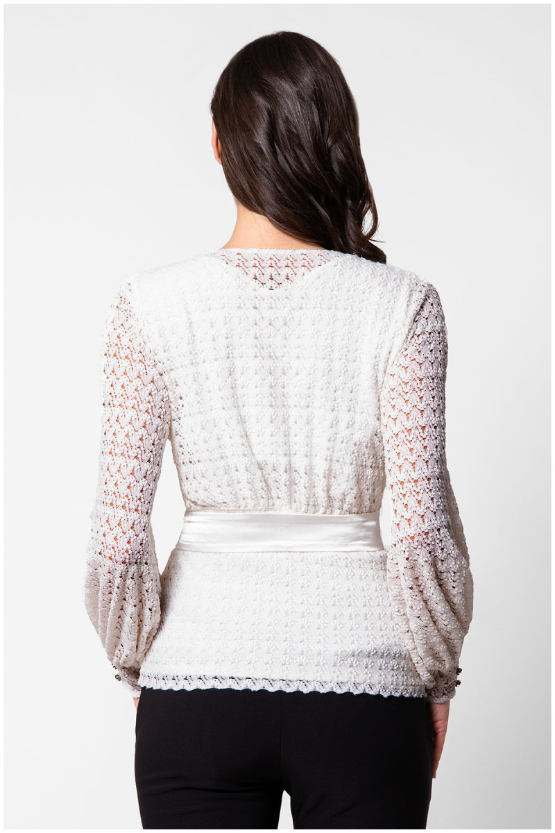 Elegantan džemper od rupičastog pletiva sa dekolteom na preklop. Kopčanje po sredini i uz pomoć kaiš trake čime ćete dodatno naglasiti struk. Idealno se kombinuje sa ostalim Luna modelima i možete ga nositi u mnogim prilikama.