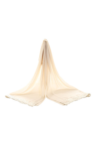 Elegantna bež ešarpa sa jedinstvenim detaljima u vidu cvetne aplikacije.