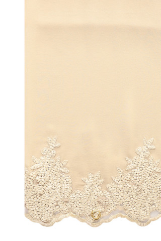 Romantična bež ešarpa je detalj koji će doprineti glamuru Vašeg outfita. Rubovi su oplemenjeni luksuznom aplikacijom zbog čega se ovaj model odlično kombinuje sa modeliam iz iste linije.