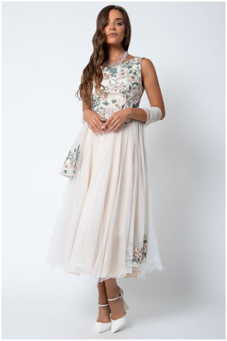 Elegantna ešarpa u bež nijansi oplemenjena autentičnim detaljima floralnog dezena. Odlično se kombinuje sa Luna haljinama što je čini savršenim modnim dodatkom za svečane prilike.