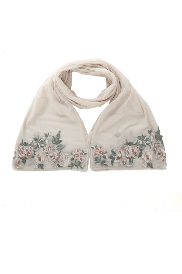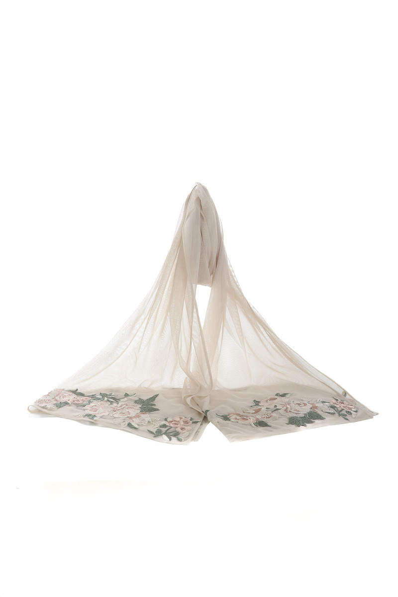 Elegantna ešarpa u bež nijansi oplemenjena autentičnim detaljima floralnog dezena.