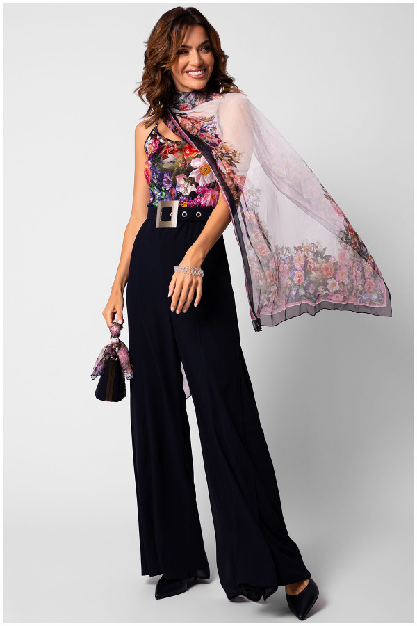 Ešarpa od svile cvetnog dezena. Upotpuniće Vaš outfit i dati mu upečatljivost. Možete je nositi uz razne Luna modele i kreirati savršen outfit.