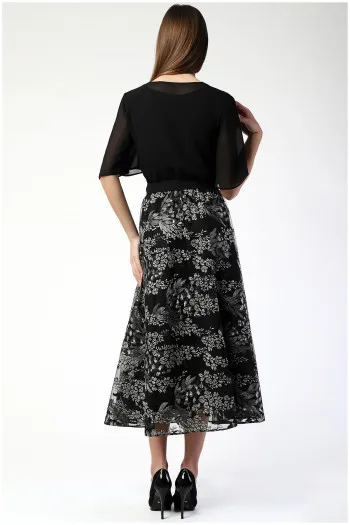Elegantna midi haljina u klasičnoj crnoj boji sa dugim transparentnim rukavima, savršen...