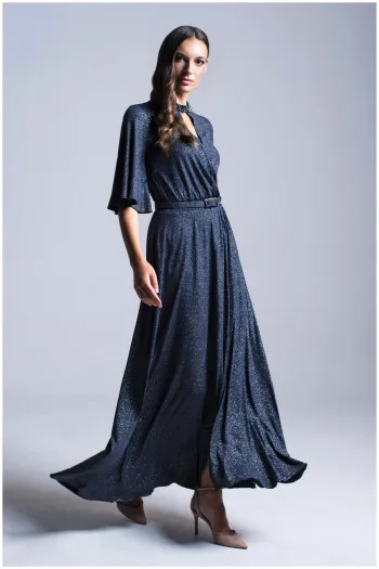 Elegantna teget haljina sa metaliziranim sjajem, dugom siluetom i suptilno otvorenim le...
