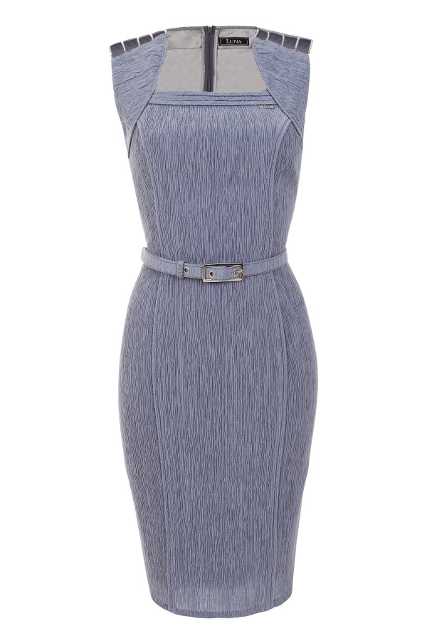 Klasična uska haljina bez rukava. Veoma udobna za nošenje zahvaljujući viskozi i elastinu. Interesantan izrez čini je upečatljivom, a na ramenima je obogaćena malim metalnim trakama. Kaiš istog dezena dodatno ističe i naglašava struk. Savršena je za dnevne i večernje prilike, a veoma lako se kombinuje sa sakoom iz iste linije.