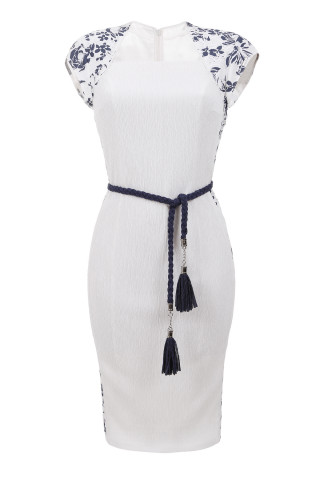 Elegantna uska haljina koja prati liniju tela. Kratki rukavi obogaćeni su floralnim dezenom, koji čini model veoma atraktivnim. Zonu struka naglašava jednobojna kaiš traka koja se može skinuti. Odlilčan izbor za dnevne ili večernje prilike, kada želite da izgledate otmeno i ženstveno.
