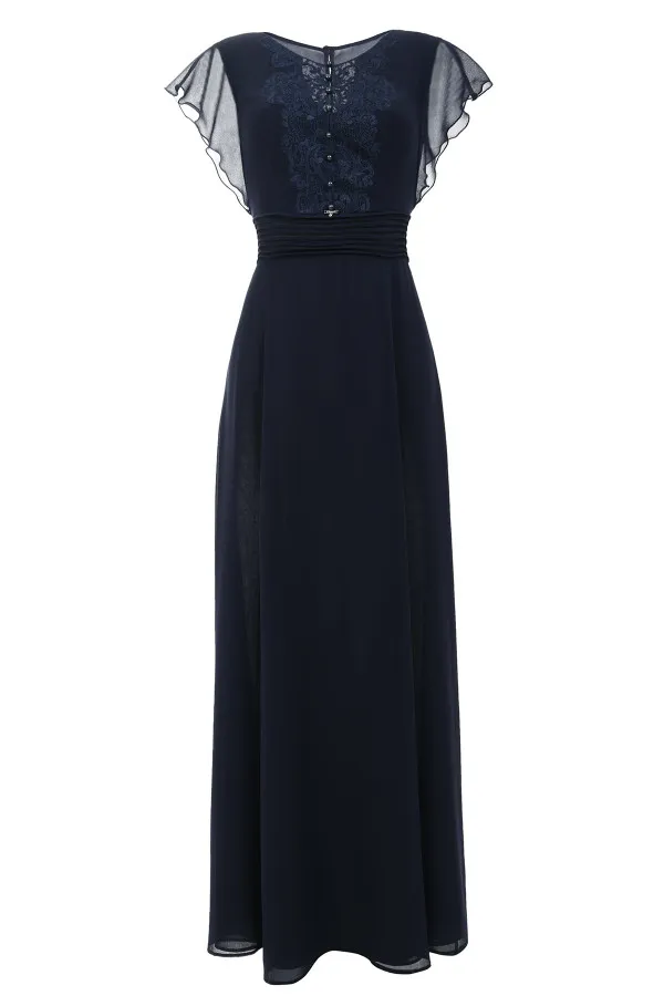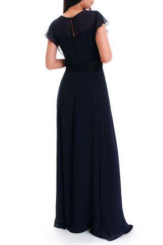 Raskošna duga haljina sa kratkim blago prozirnim rukavima. Predeo dekoltea obogaćen je vez čipkom i ukrasnim dugmadima. U predelu struka oplemenjena je horizontalnim porubima u vidu pojasa. Savršen je izbor kada želite da izgledate glamurozno i primećeno.