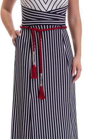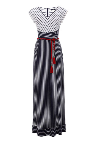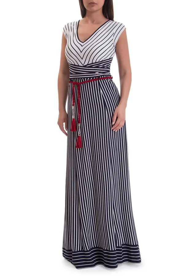 Duga efektna haljina sa kratkim rukavima. Dizajnirana je od veoma laganog materijala i savršeno pristaje svakom tipu građe. Jedinstveni dezen na pruge čini je atraktivnom, a ukrasna traka ističe struk i celu figuru. Savršena je za dnevne, kao i večernje prilike.