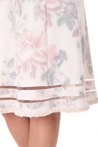 Ženstvena haljina, A kroja, sa zvonastim tri-četvrt rukavima. Floralni dezen ovom modelu daje notu senzualnosti, dok detalj u predelu biste unosti dozu ženstvenosti. U kombinaciji sa ešarpom i torbom zablistaćete u svečanim prilikama.