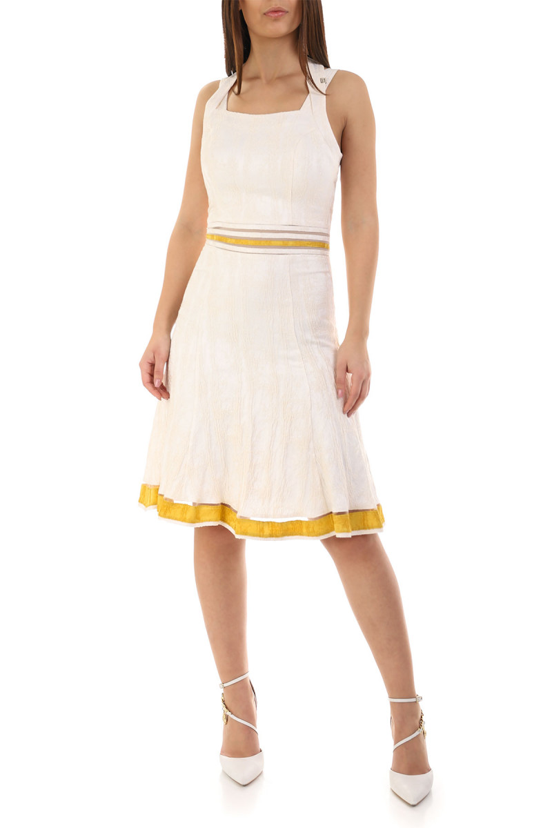 Elegantna široka haljina sa bratelama trakom za vezivanje oko vrata. U ovom modelu ćete se osećati veoma razdragano i poletno, i iz Vas će zračiti mladalački duh. Uz dodatak sakoa istog dezena stvorićete savršeno stilizovani outfit u kome ćete sigurno biti zapaženi.