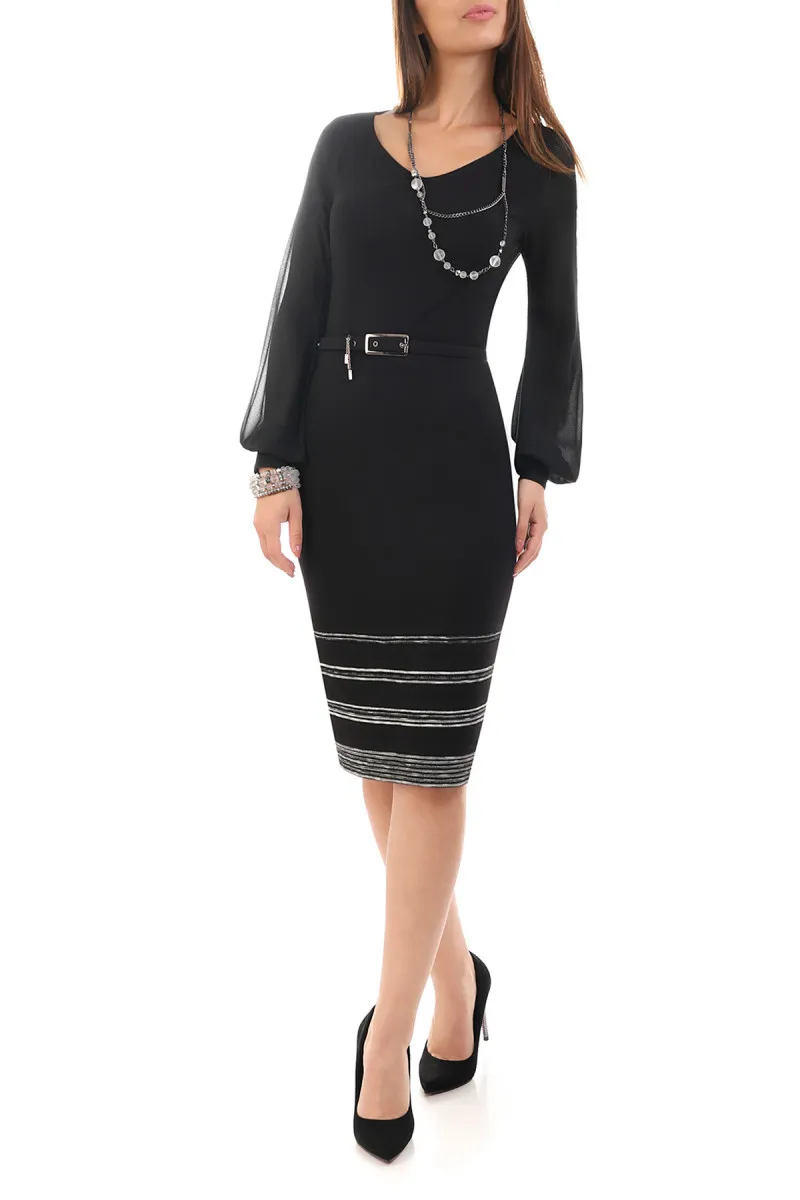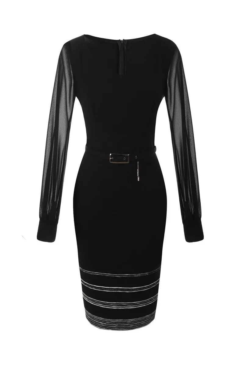 Uska haljina srednje dužine izrađena je od elastične viskoze što je čini jako udobnom i prijatnom. Transparentni rukavi od tila pružaju komfor, tako da je pokretljivost Vaših ruku zagarantovana. Kaiš na struku vizuelno sužava struk.