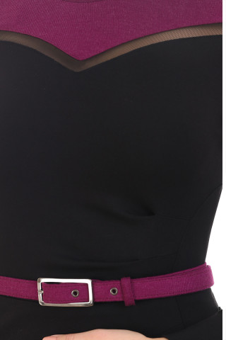 Moderna haljina sa rol kragnom pogodna je kako za poslovne tako i svakodnevne prilike. U sastavu materijala ima veliki procenat elastina pa je veoma rategljiva i udobna za nošenje a pruža i dovoljan komfor za pokretljivost ruku i tela u njoj. Kaiš po potrebi sa nje možete i skinuti. Falte u predelu pojasa vizuelno uobličavaju figuru i odlično kamufliraju predeo stomaka.