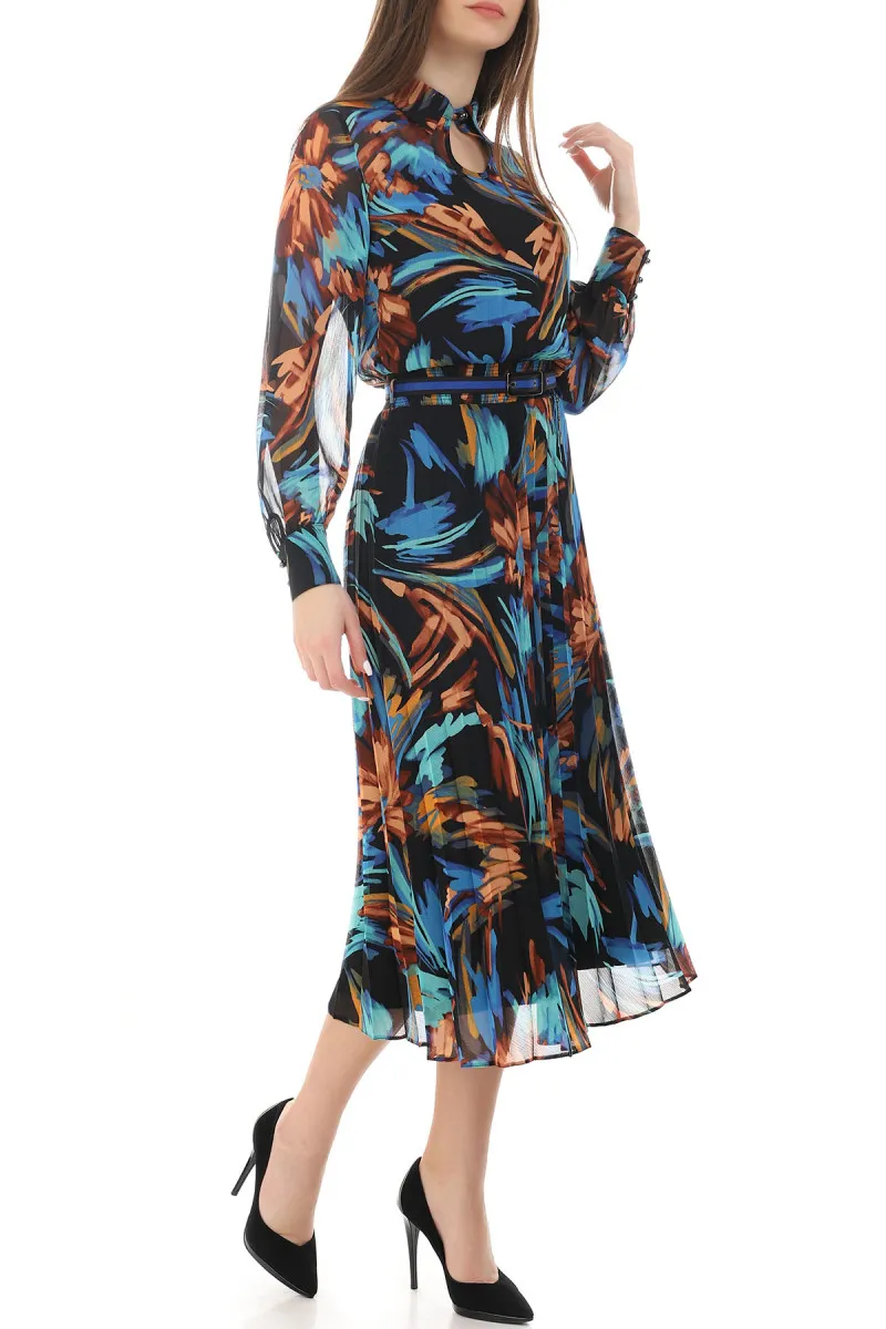 Elegantna haljina cvetnog dezena sa dugim rukavima svojim krojem pogoduje svim građama i oblicima tela i pruža savršenu udobnost prilikom nošenja. Lagani materijal cvetnog dezena postavljen je viskoznom postavom u gornjem delu, u formi majice na bratele, koja je veoma mekana na dodir pa će Vam njeno nošenje sigurno prijati. U donjem delu postava od satena pružiće Vam dodatnu sigurnost i lakoću nošenja. Lastiš koji je na pojasu savršeno se prilagođava svakom obimu struka, formirajući izgled figure peščanog sata. Ovaj model haljine sa lakoćom možete nositi u mnogim prilikama, od poslovnih do svakodnevnih, i lako je možete prilagoditi svom stilu koji negujete. Kaiš dolazi u kompletu sa haljinom i po potrebi ga možete skinuti.