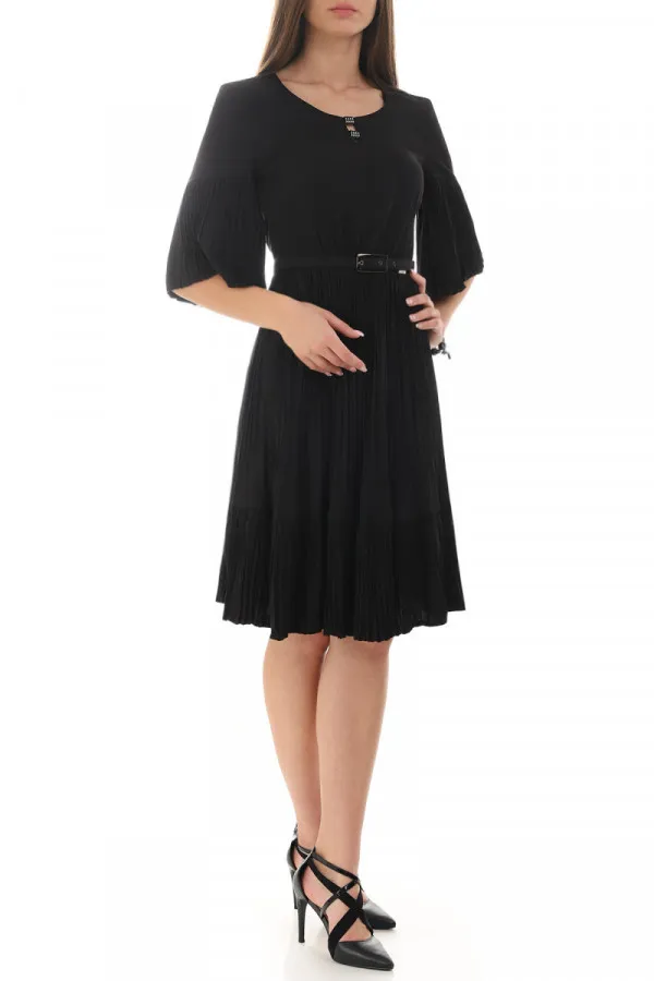 Elegantna, usko krojena haljina u crnoj nijansi sa V-izrezom, odvojivim lepršavim rukav...