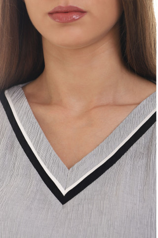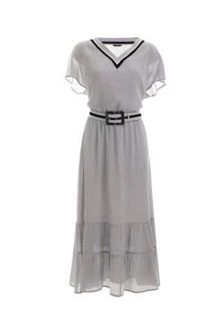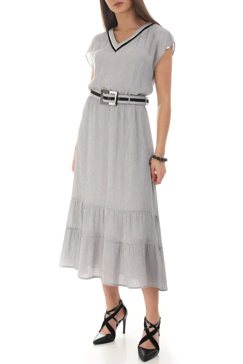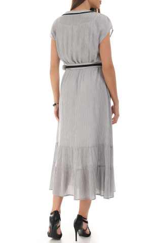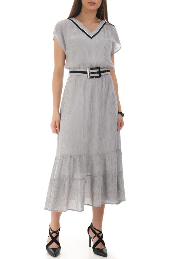 Duga haljina kratkih rukava izrađena je od viskoze sa elastinom što je čini jako udobnom za nošenje. Dodatna tkanina ispod obezbeđuje da haljina ne bude transparentna, a Vama pruža sigurnost i komfor. Pojas je rastegljiv i prilagođava se svakom obimu struka. Struk je dodatno naglašen kaišem koji možete skinuti po potrebi. Kroj haljine je takav da pristaje damama sa različitim tivomima građe tela. Odlična je kako za poslovne tako i za elegantnije ili opuštenije prilike.