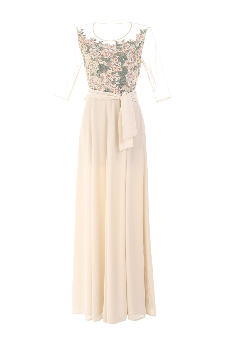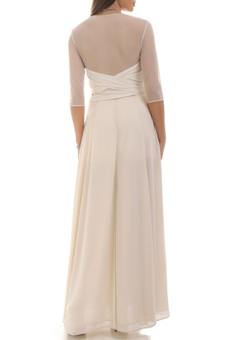 Elegantna, usko krojena haljina u krem nijansi sa V-izrezom, odvojivim lepršavim rukavi...