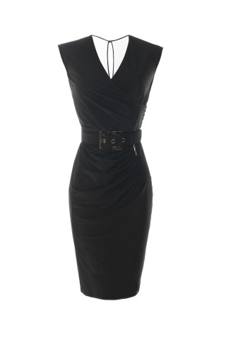 Crna svečana midi haljina sa V-izrezom, funkcionalnim dugmadima, odvojivim kaišem i lep...