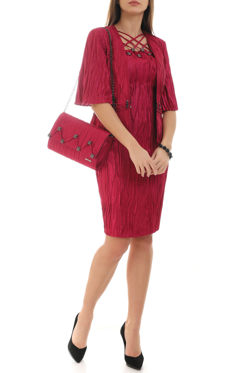 Haljina je izrađena od materijala reljefne teksture dobijene posebnom tehnikom izrade. Kroj prati liniju tela. Zonu dekoltea krase ručno izrađeni detalji. Ovaj model savršeno laska svakoj figuri i odlično se kombinuje sa pratećim sakoom.
