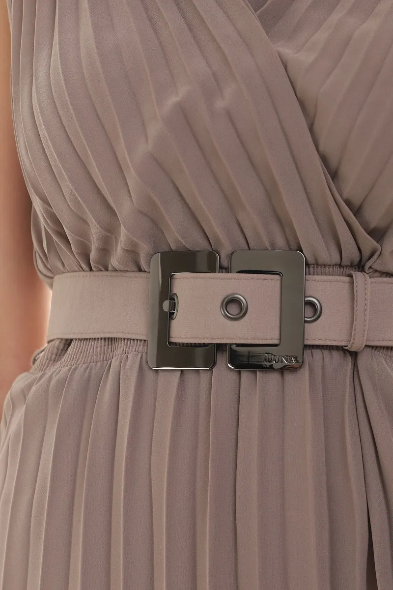 Široka midi haljina sa rebrastim dezenom u crvenoj boji, dvopoteznim rajsferšlusom i po...