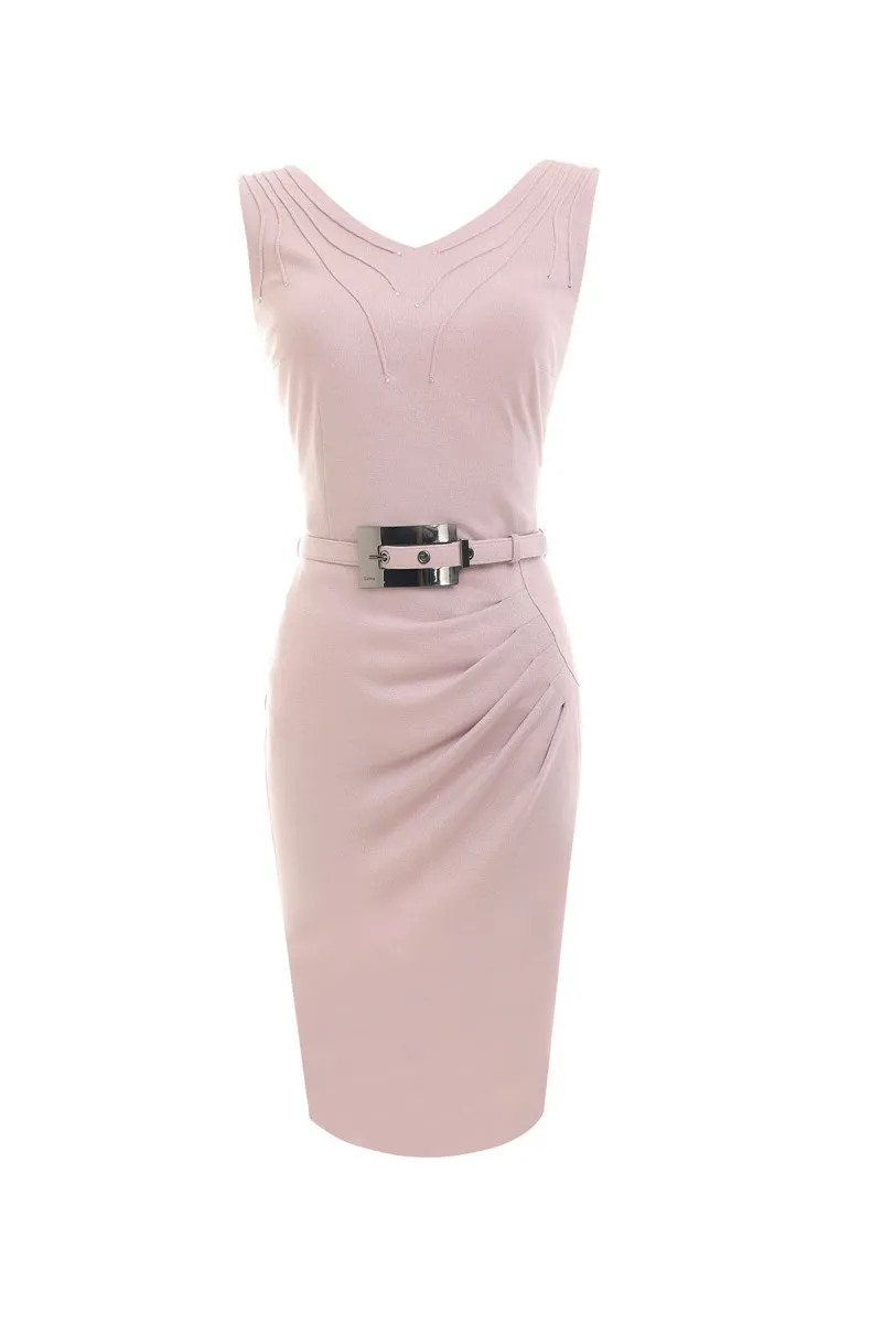 Elegantna, usko krojena haljina u krem nijansi sa V-izrezom, odvojivim lepršavim rukavi...