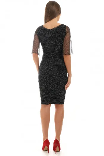 Elegantna, usko krojena haljina u crnoj nijansi sa V-izrezom, odvojivim lepršavim rukav...