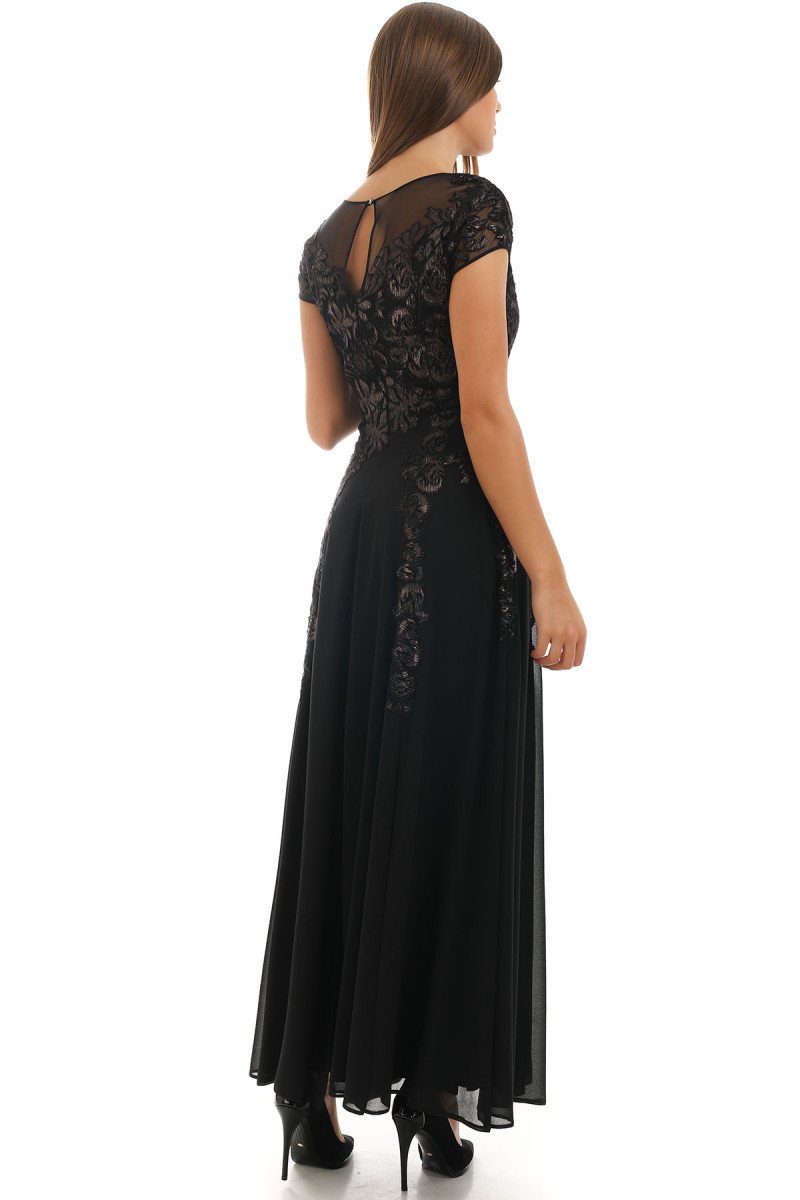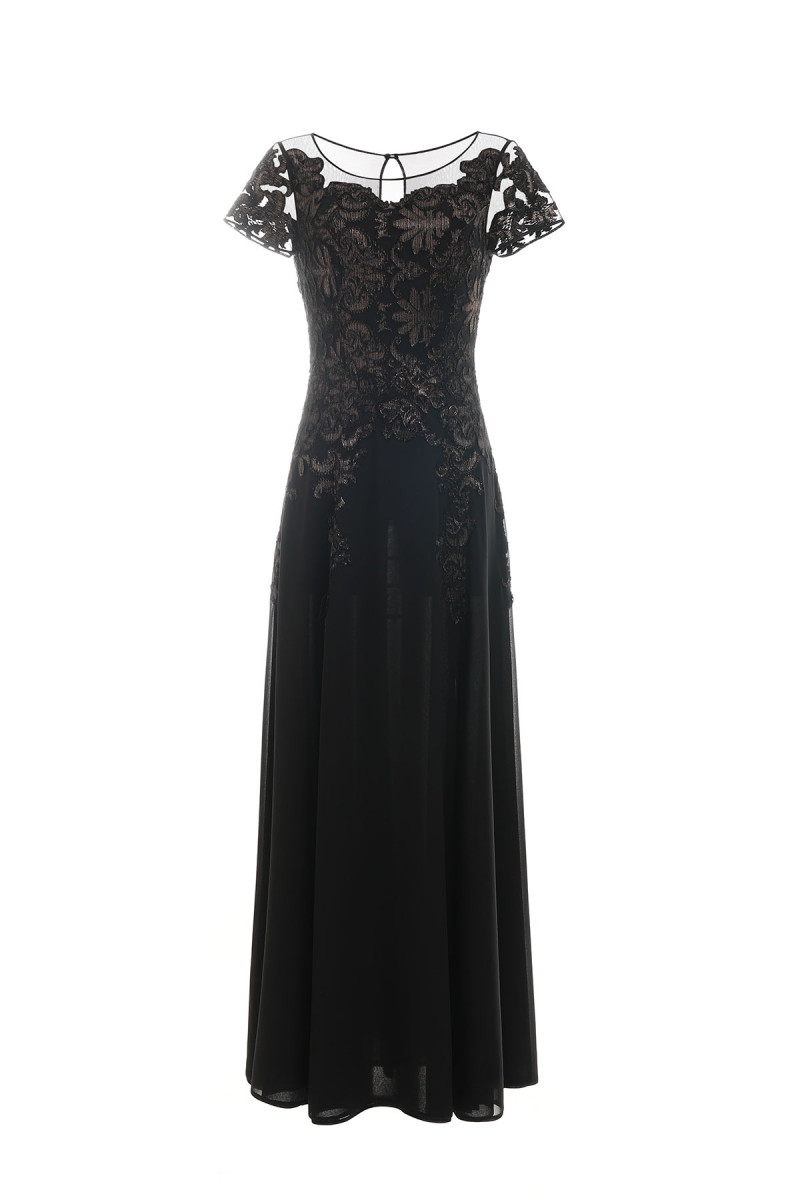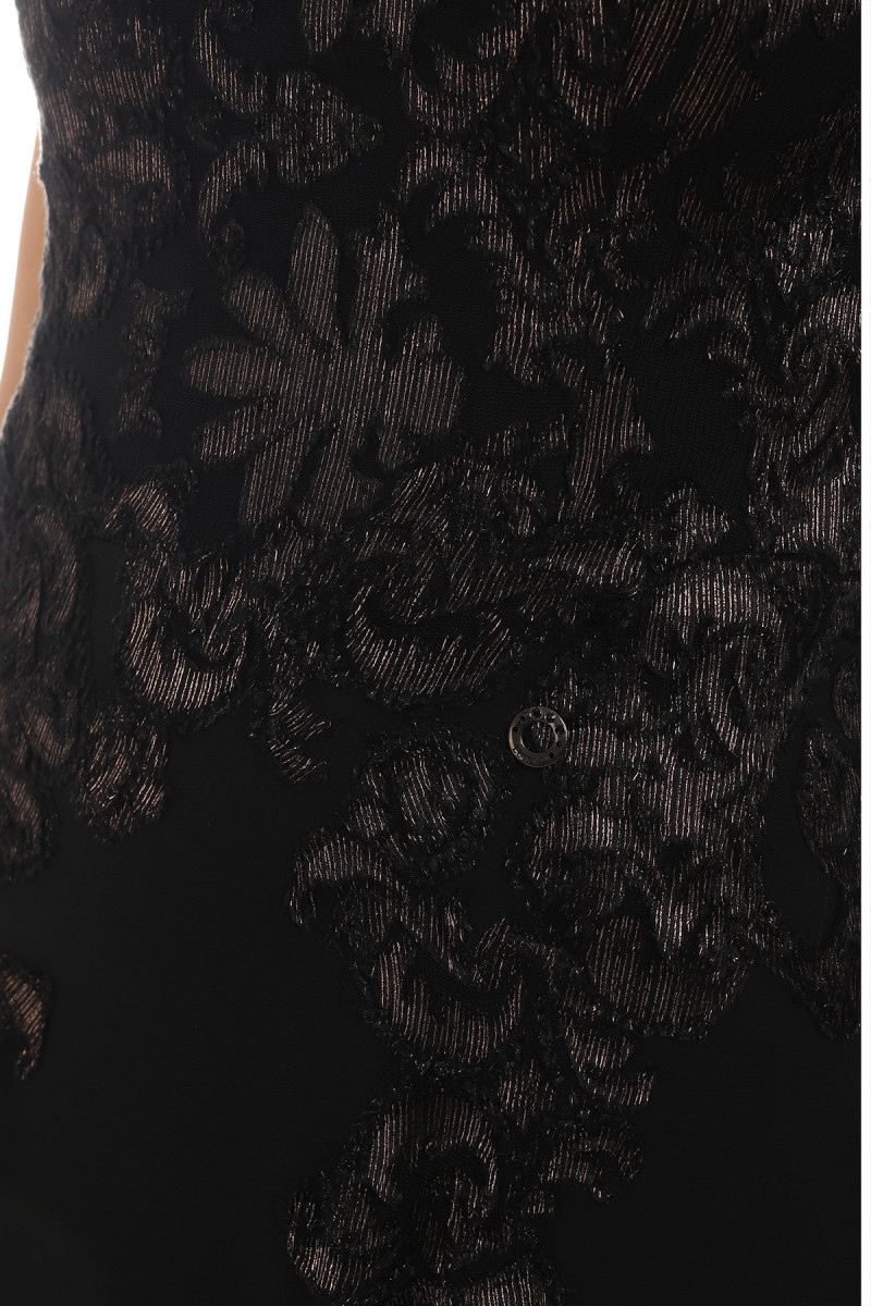 Crna uska haljina sa spuštenim ramenima, naborima i nežnim cirkonima u središtu dekolte...