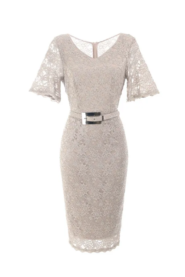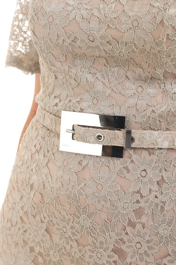 Romantični model haljine od čipke za posebne prilike. Ovaj model zahvaljujući kroju ističe ženstvenost, a struk je dodatno akcentovan kaišem koji se može skinuti. U kombinaciji sa pismo torbom i mantilom kreirajte pravi outfit za odlazak na jesenju svadbu.
